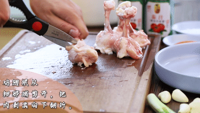 雞翅根從細(xì)的那端剪開、把肉和骨頭剝離向下翻折。弄好后放碗里