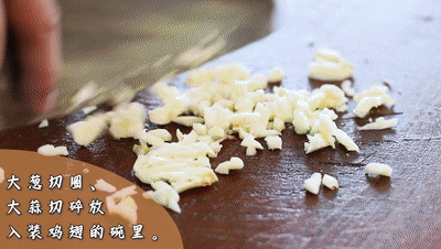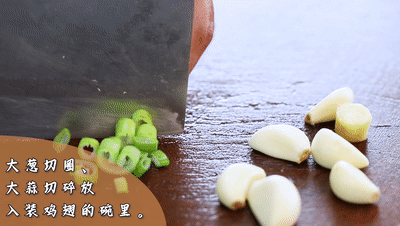 把大蔥切圈、大蒜切碎放入裝雞翅的碗里