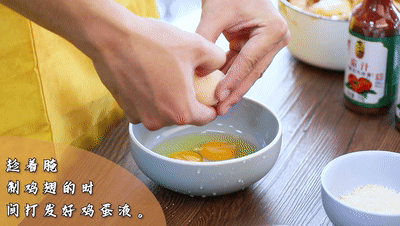 趁著腌制雞翅的時間打發(fā)好雞蛋液