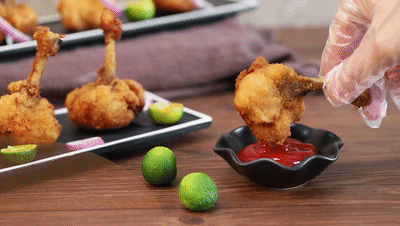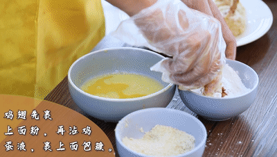 腌制好的雞翅先裹上一層面粉,再沾上雞蛋液,再裹上面包糠
