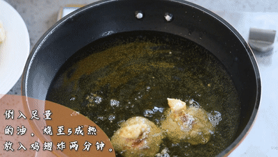 鍋里倒入足量的油,燒至5成熱,放入雞翅炸兩分鐘、炸至定型撈出。再轉(zhuǎn)中大火翻炸一次即可