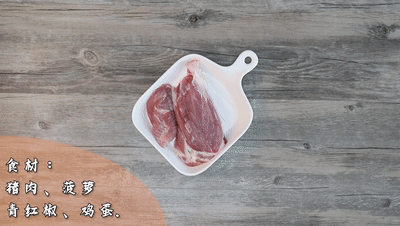 ● 豬肉切大粒,放入黑胡椒、鹽、生粉、油、東古一品鮮醬油、一只雞蛋。攪拌均勻,腌制20分鐘