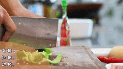 ● 熱鍋燒油、倒入菠蘿,青紅椒,炒至7成熟左右。倒入炸熟的肉粒和料汁,翻炒均勻即可