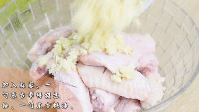 雞翅放碗里,加入蒜蓉、一勺東古零特級生抽、一勺東古蠔油、一勺東古姜蔥料酒、一勺鹽,抓拌均勻、腌制15分鐘