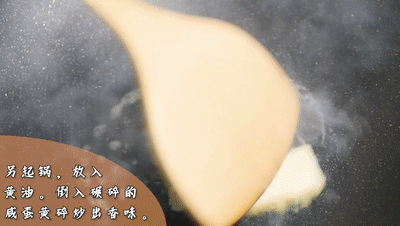 另起鍋,放入一塊黃油。再倒入碾碎的咸蛋黃碎炒出香味。