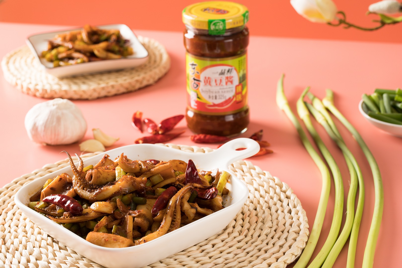 再倒入魷魚,加入一勺辣椒面、一勺一品鮮醬油、一勺東古蠔油、一勺黃豆醬,翻炒均勻即可