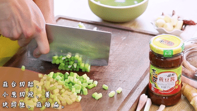 蒜臺切粒,小蔥切段,姜塊切絲。然后把魷魚處理好,切成中小塊