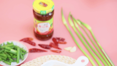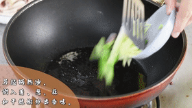 另起鍋熱油,倒入姜、蔥、蒜和干辣椒炒出香味。再倒入蒜臺,炒斷生