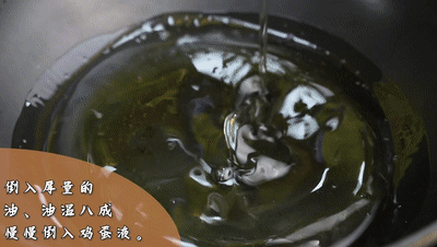 鍋里倒入厚量的油、油溫八成慢慢倒入雞蛋液,炸至兩面定型撈出控油備用
