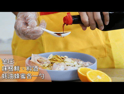 一勺料酒、3 勺生抽、一勺老抽、一勺蠔油、一勺蜂蜜、少許黑胡椒和鹽,半個(gè)橙子的橙汁,戴手套抓拌均勻后,腌制兩小時(shí)。