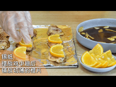 烤盤鋪上錫紙,雞翅中擺好位置,再依次放切薄的橙子片,烤箱預(yù)熱后,200℃ 先烤 10 分鐘。