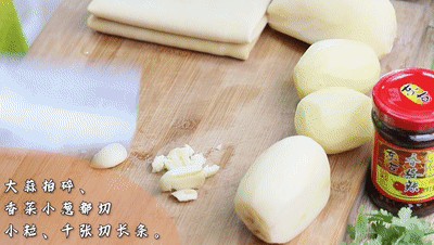 大蒜拍碎、香菜小蔥都切小粒、千張切長條