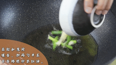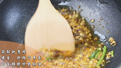 再倒入蒜粒和蔥段爆香、加入兩勺半東古香格辣炒出紅油。