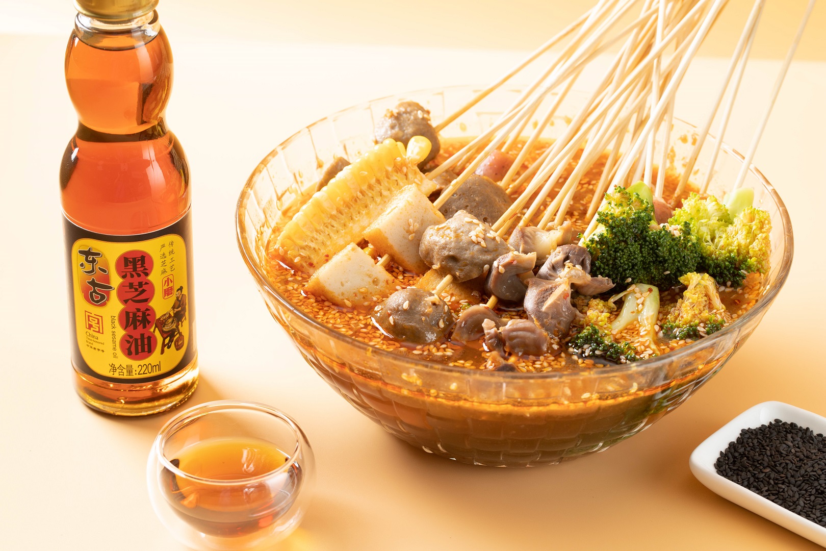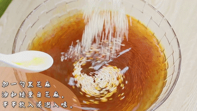 最后加入一勺東古黑芝麻油和適量白芝麻,把串串放入浸泡入味即可