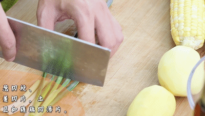 蔥切段、姜切片,土豆和蓮藕切薄片,西蘭花切中小塊、玉米對半折斷、再砍成四長段