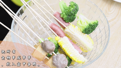 把所有食物串成串串,放入盆中備用