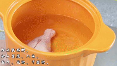 最后就是熬雞湯:鍋里放水,冷水放入兩個雞腿,加入姜、蔥、八角、香葉、花椒、干辣椒,蓋蓋熬半個小時,加入一勺東古一品鮮雞精和東古雞粉,在熬煮10分鐘