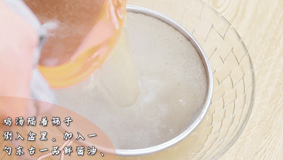 熬好的雞湯撈出湯渣,再隔著篩子倒入盆里。加入一勺東古一品鮮醬油、一勺東古蠔油、一勺紅油辣椒醬(喜歡吃辣的可以多放點)攪拌均勻