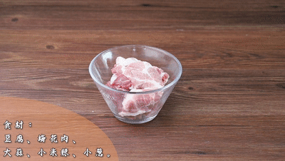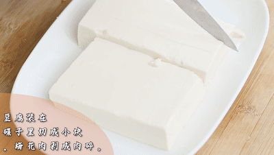 豆腐裝在碟子里直接用刀切成小塊,梅花肉剁成肉碎