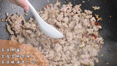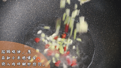 另起鍋燒油,倒入蔥蒜和小米辣爆香,再倒入肉碎翻炒均勻