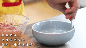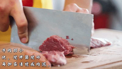 牛肉切小塊 然后放入攪拌器攪碎 再加入蛋清 攪成肉泥