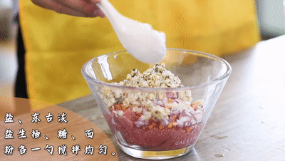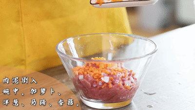 肉泥倒出碗中,加入蘿卜、洋蔥、馬蹄、香菇