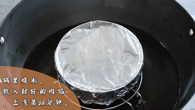 鍋里燒水,把封好錫紙的肉餡放入,上汽蒸20分鐘。然后打開(kāi)錫紙,把打好的蛋液倒在牛肉上,再重新用錫紙封好,再蒸20分鐘即可