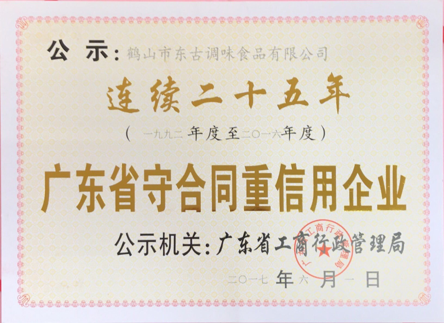 2017連續(xù)25年廣東省守合同重信用企業(yè)