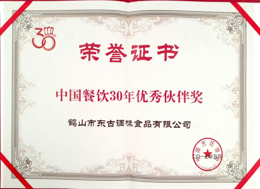 2017中國餐飲30年優(yōu)秀伙伴獎證書