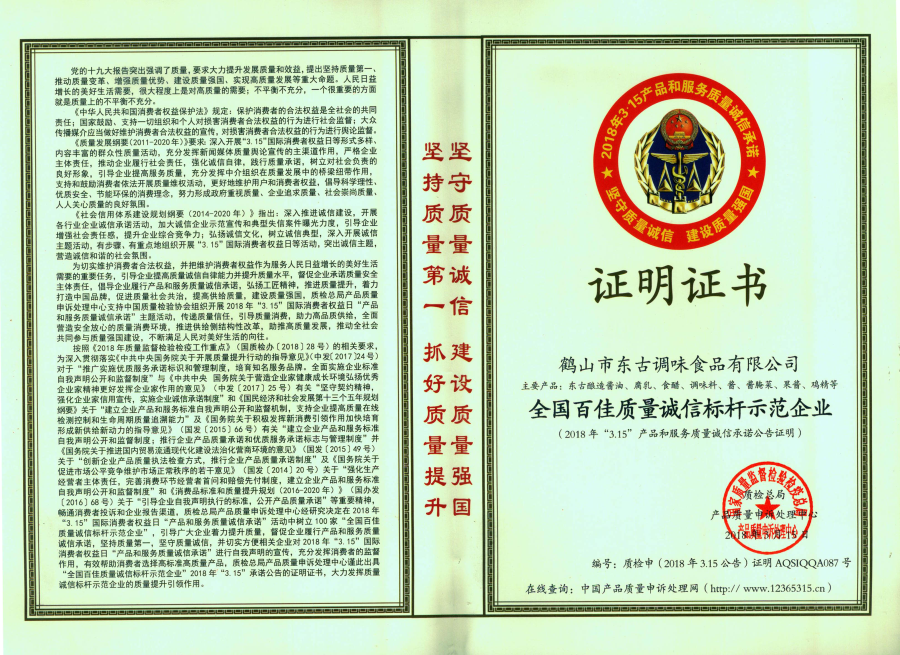 2018年315全國百佳質(zhì)量誠信標桿示范企業(yè)