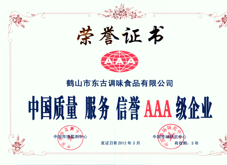 2012中國質(zhì)量服務(wù)信譽AAA級企業(yè)榮譽證書