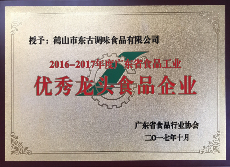 2016-2017年度廣東省食品工業(yè)優(yōu)秀龍頭食品企業(yè)牌匾
