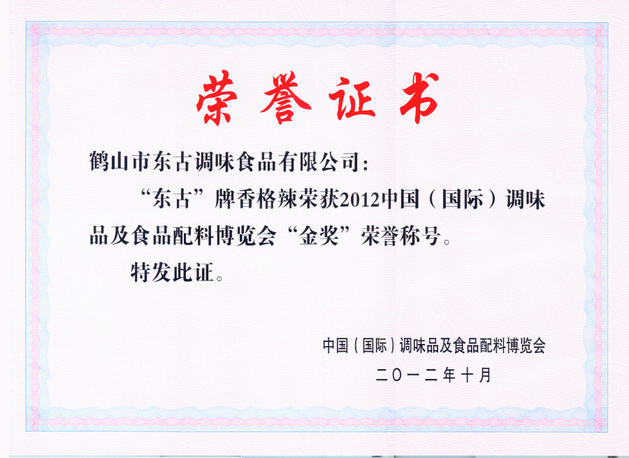 2012香格辣調(diào)味品及食品配料博覽會金獎(jiǎng)證書