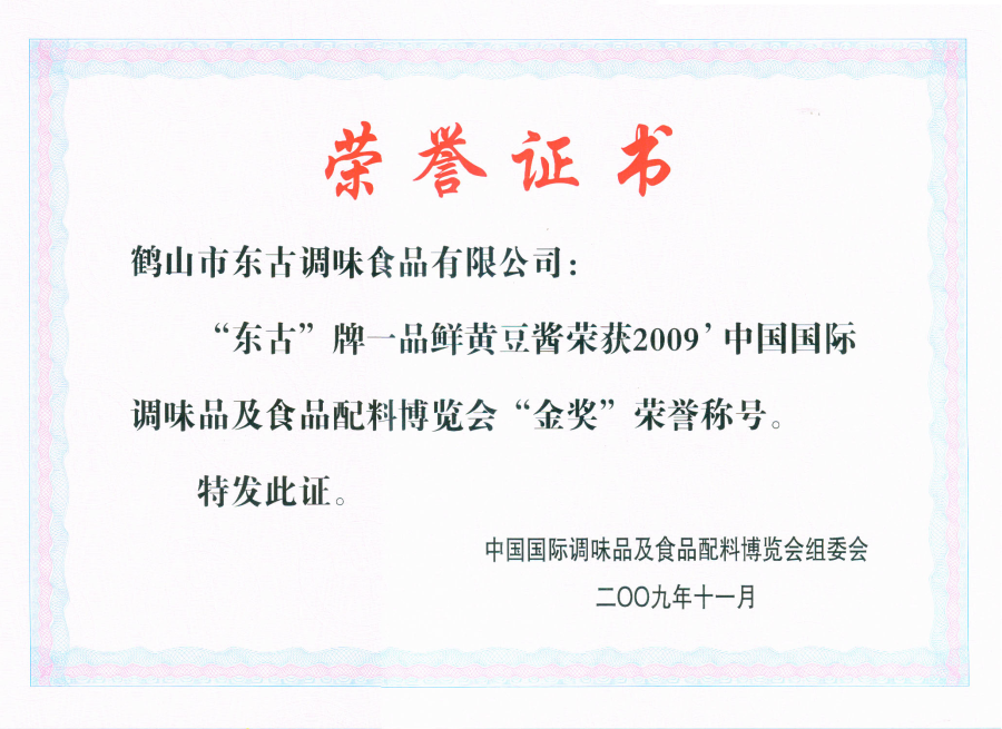 2009一品鮮黃豆醬09國(guó)際調(diào)味品及食品配料博覽會(huì)金獎(jiǎng)