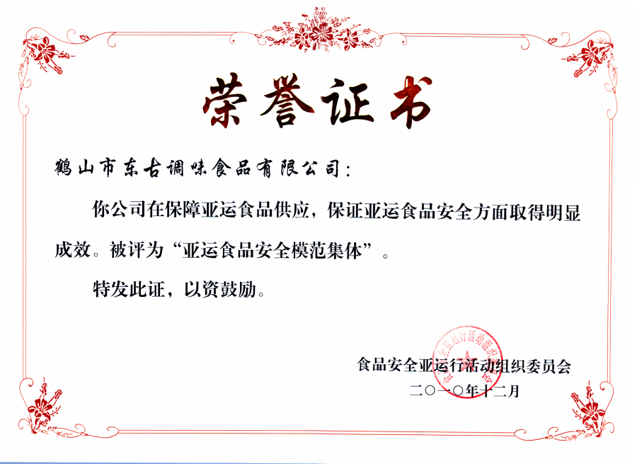 2010亞運(yùn)食品安全模范集體證書